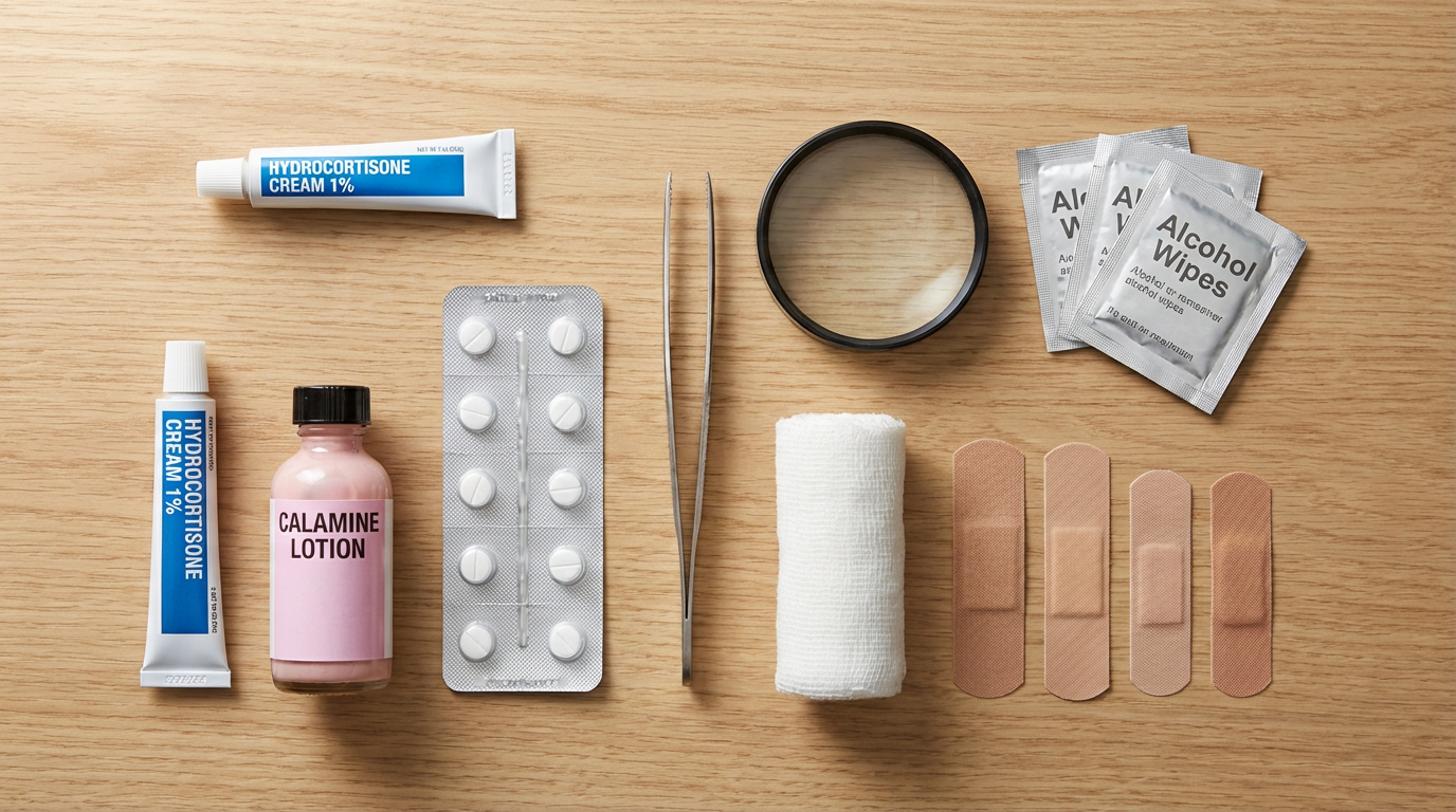 Wash the bite with soap and water, apply a cold compress, then use hydrocortisone cream or calamine lotion for topical relief. Add an oral antihistamine for stronger symptoms. Avoid scratching to prevent secondary infection.